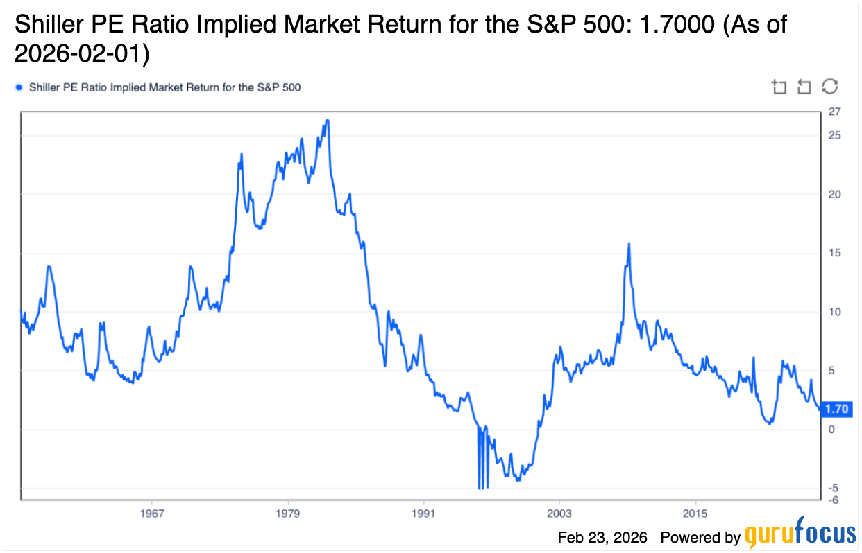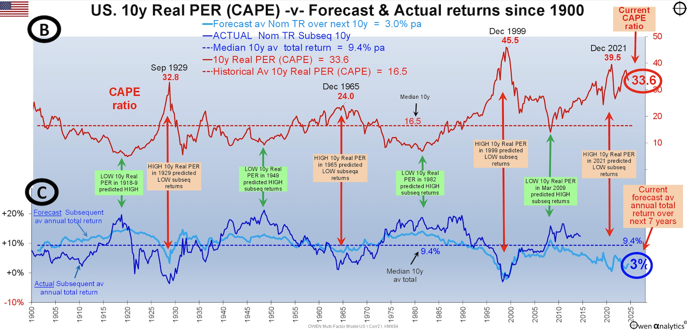 Долната графика показва CAPE коефициента през от 1900 до 2025 година, очакваната доходност в следващите 10 години (светло синьо) и реализираната доходност в следващите 10 години (тъмно синьо). На нея ясно може да се види, че реалната доходност на широкия пазар следва прогнозната стойност (тъмно синята линия), а в някои периоди я изпреварва както позитивно, така и негативно. Графиката е от Април 2025, като от тогава, след силната 2025, имаме още по-ниски очаквания за доходността в следващите 10 години - 1.6% към Февруари 2026.