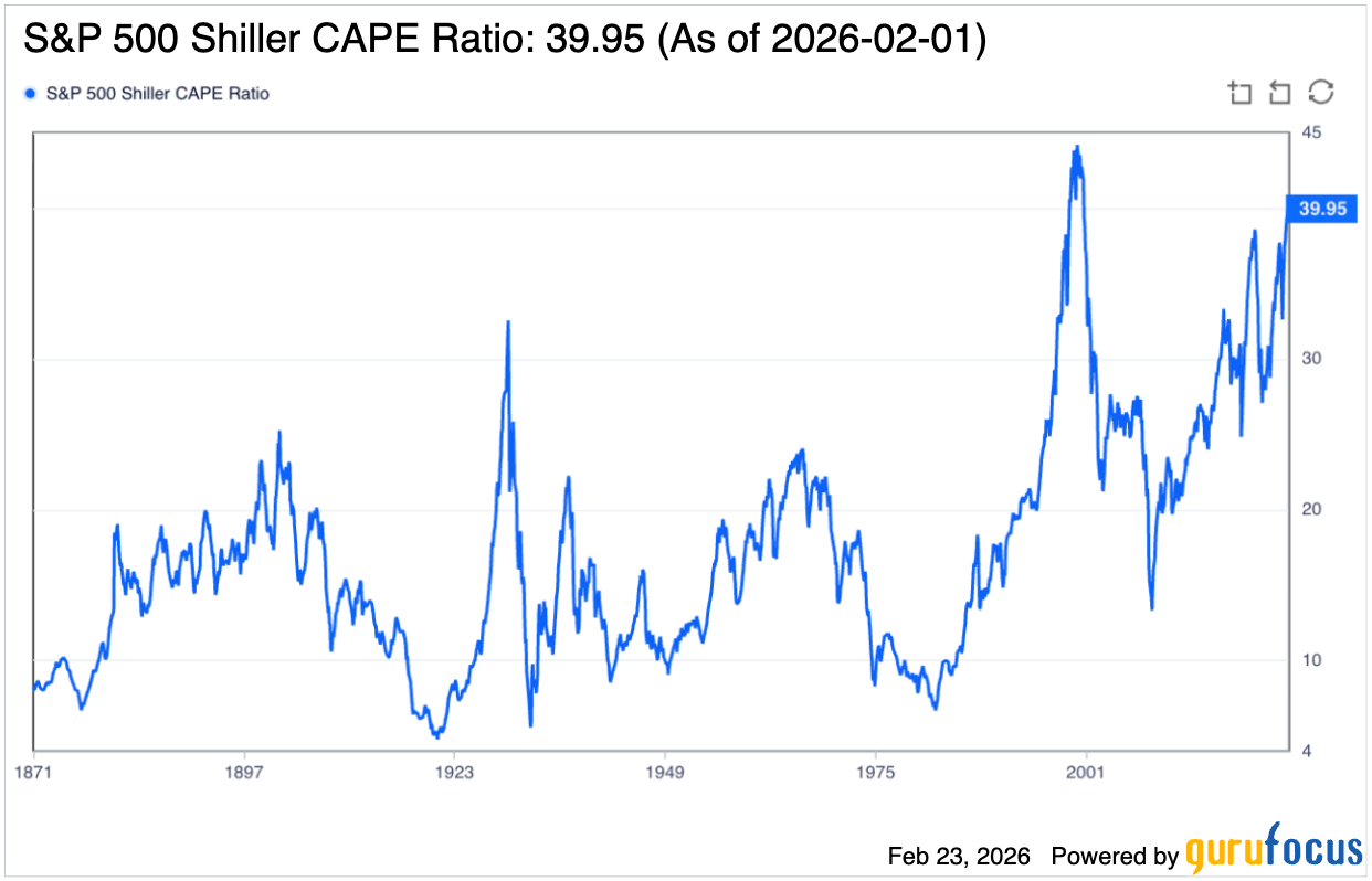 Ключовият показател CAPE, който измерва колко скъпи са акциите спрямо дългосрочните печалби, удари 39.9 — ниво, което се е случвало само в най-горния 1% от наблюденията за последните 140+ години. Това поставя днешните оценки близо до историческите върхове (пикът е през 2000 г. при dot-com балона), двойно над дългосрочната средна стойност от 17.7 и значително над средните 31.5 за последното десетилетие.