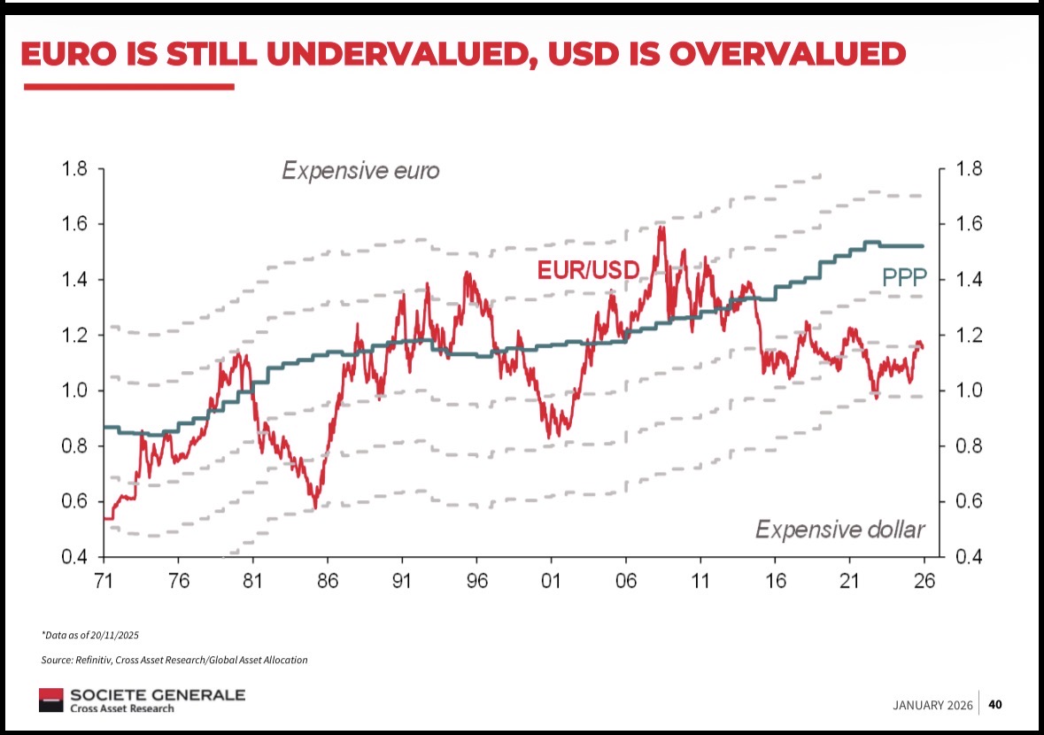 Графиката на Societe Generale ясно показва още един важен фактор за европейските инвеститори: еврото остава силно подценено спрямо долара, а доларът – надценен. Когато комбинираме това с очакваното забавяне на ръста в S&P 500, се получава неприятен двоен удар за хората в Европа, които инвестират през нехеджирани в евро S&P 500 ETF-и. Ако доходността в САЩ се нормализира надолу, а доларът отслабне спрямо еврото, европейският инвеститор губи два пъти – веднъж от по-слабия пазар и втори път от валутата. Това е риск, който пасивните инвеститори системно подценяват, защото гледат само индексната доходност в долари, без да отчитат валутния ефект, който реално получават в евро.